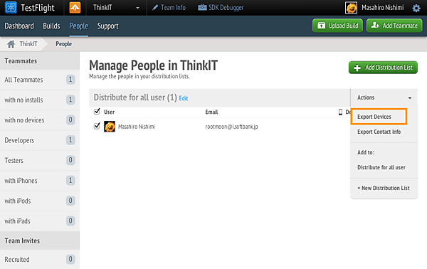 AdHoc配信を行うためには配信先のデバイス情報をiOS Provisioning Portalに登録しておく必要があります。配信先のデバイス情報は図の通り、TestFlightのユーザー管理画面から「Actions > Export Devices」を選択して取得することができます。選択するとテキストファイルの形でローカルにダウンロードされます。