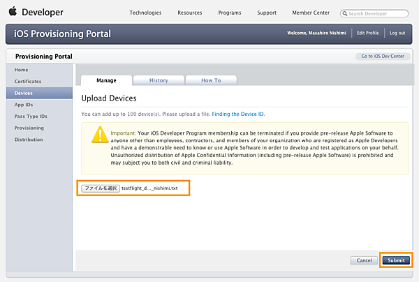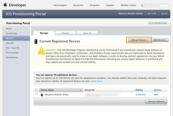 このテキストファイルをiOS Provisioning Portalに登録します。iOS Provisioning Portalにアクセスし、Devicesから「Upload Devices」をクリックします。