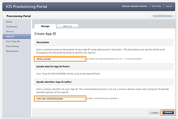 Provisioning Profile作成のためにApp ID(iOSアプリのID)が必要になりますので、ここで登録しておきます。ここでは以下の情報でApp IDを登録しました。