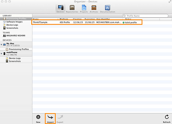 取得したProvisioning ProfileをXcodeにインストールします。XcodeからOrganizerを開き、「Provisioning Profiles > Import」でダウンロードしたファイルを選択し、インストールを行います。