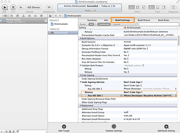 アプリのプロジェクトのBuild SettingsにProvisioning Profileを設定します。「Build Settings > Code Signing > Code Signing Identity > Relase > Any iOS SDK」にインストールしたProvisioning Profileを設定してください。
