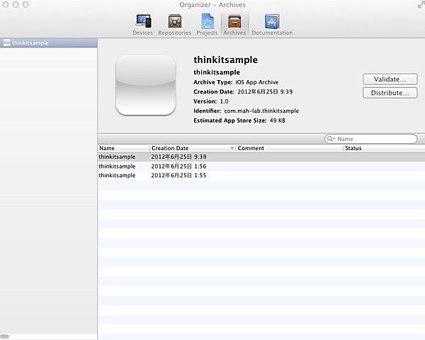 ビルド後にアプリをipaファイルとして出力するために、「Product > Archive」を選択してアーカイブを行います。アーカイブを行うと図のように、「Organizer > Archives」にアーカイブが作成されます。