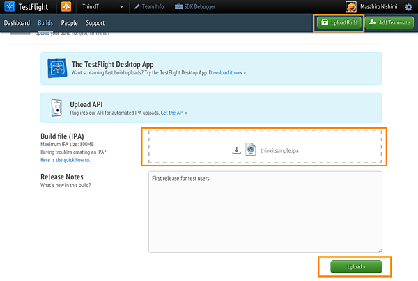 ipaファイルを出力したら、TestFlightに戻り「Upload Build」ボタンをクリックし、アップロード画面を開きます。ipaファイルを枠内にドラッグ&ドロップし、リリースの内容を設定し、「Upload」ボタンをクリックします。
