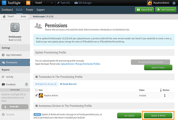 「Upload」ボタンをクリックすると、配布に関する情報を設定する画面が表示されます。配布先のユーザーを確認し、「Update & Notify」ボタンをクリックするとテストユーザー宛に「Install」というリンクを同梱したメールが配信されます。テストユーザーは「Install」リンクをクリックすると、アプリをインストールすることができます。