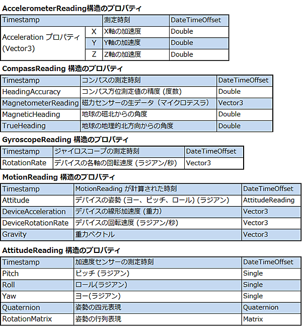 まず、Windows Phone アプリ開発でセンサーからのデータを利用したい場合は、Microsoft.Devices.Sensors 名前空間のクラスを用います。次の4種類のデータを取得できます。