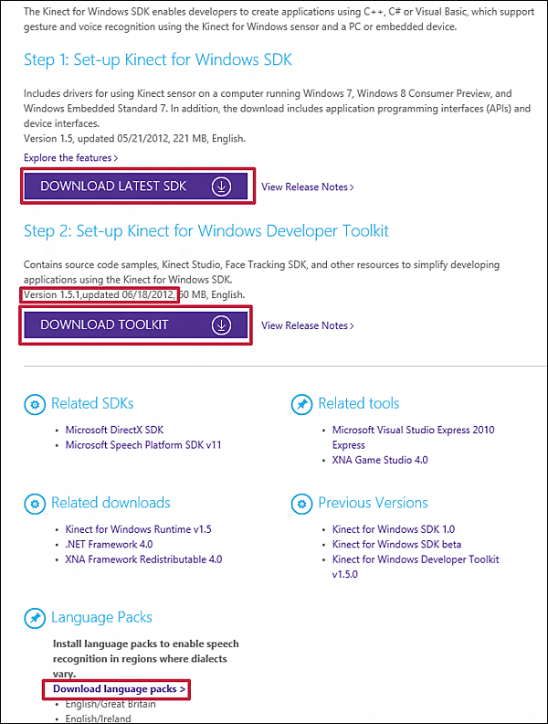 | 図1:Kinect for Windows SDK1.5とKinect for Windows Developer Toolkit 1.5.1とLanguage Packsをダウンロードする(クリックで拡大) |