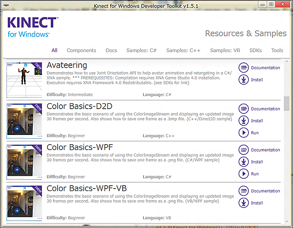 | 図2:Kinect for Windows Developer Toolkit 1.5.1 をインストールして表示される「Developer Toolkit Browser v1.5.1(Kinect for Windows)」(クリックで拡大) |