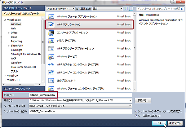 VS 2010のメニューから[ファイル(F)/新規作成(N)/プロジェクト(P)]と選択します。次に、「WPF アプリケーション」を選択して、「名前(N)」に任意のプロジェクト名を指定します。ここでは「KINECT_CameraShow」という名前を付けています(図4)。