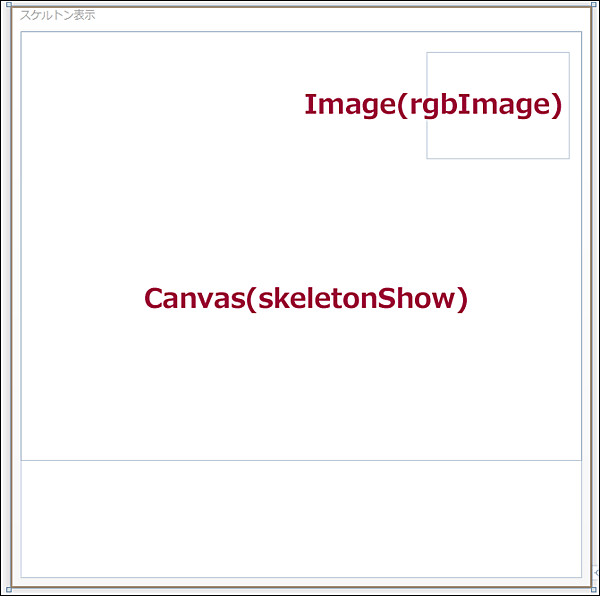 ツールボックスからデザイン画面上にCanvasコントロールを1個配置します。名前はskeletonShowとします。次にImageコントロールを1個配置します。名前はrgbImageとします。