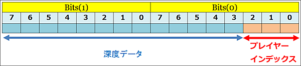 と記述して、depthData(i) をDepthImageFrame.PlayerIndexBitmaskWidth 分、右へシフトします。つまり、3ビット(DepthImageFrame.PlayerIndexBitmaskWidth分)右へシフトするとプレイヤーの深度のデータだけを取得できます。