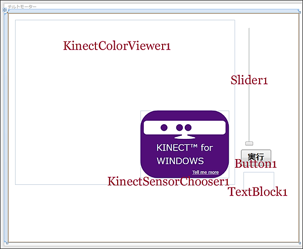 ツールボックスからデザイン画面上にKinectColorViewerコントロールを1個、Sliderコントロールを1個、KinectChooserSensorコントロールを1個、ButtonとTextBlockコントロールを1個ずつ配置します。