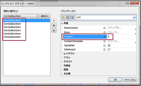 | 図1:ComboBoxコントロールの「コレクションエディター」からComboBoxItemを追加し、Contentプロパティの値を設定した(クリックで拡大) |