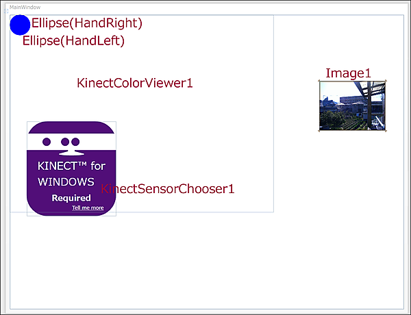 ツールボックスからデザイン画面上に、KinectColorViewerと、KinectSensorChooser、Imageコントロールを1個ずつと、Ellipseコントロールを2個配置します。