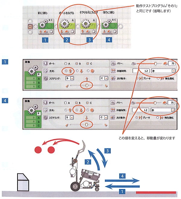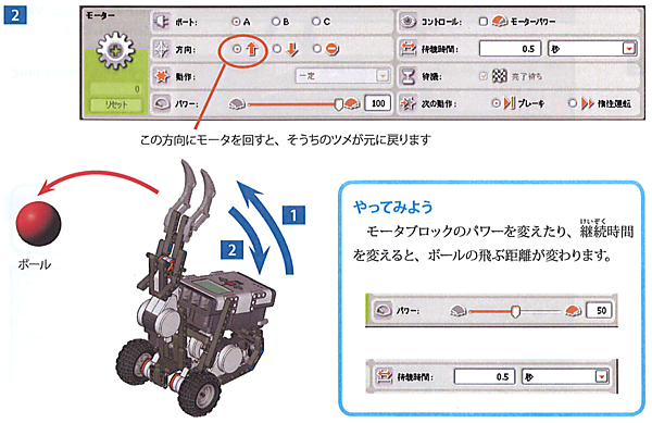 さらに、同じ設定のモーターブロックをプログラムの一番最後に入れて、逆の方向を指定すれば、ボールを投げ終わったあと、元の位置まで戻すことができる。