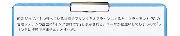 「妙に印刷機能を細かくチェックしたテスト結果が届いているな。テスト結果自体は細かくチェックしてもらっていて、どれも修正しないといけないレベルではあるけど、今回のシステムは、まだIT化できずに残っている書類による業務を完全にペーパレスに置き換えるためのものだから、印刷機能の優先順位はそれほど高くないんだけど・・・。別の機能のバグ修正もあるし、対応の優先順位を下げたいなぁ。最初に十分打ち合わせしておけば、こうはならなかったなぁ。」