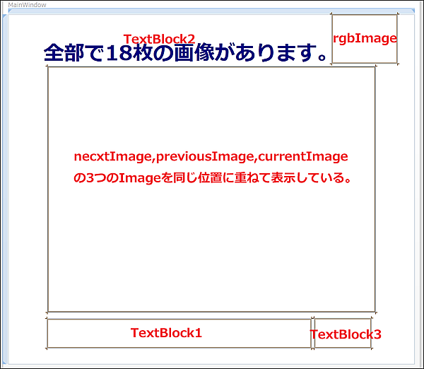 • (2)要素でx:NameがnextImageとpreviousImageのOpacityに0を指定し透明化しておく。