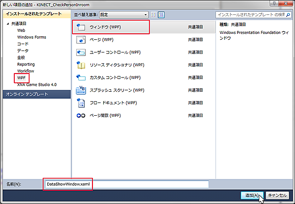 右側に表示される項目から「ウィンドウ(WPF)」を選択し、「名前(N)」に「DataShowWindow.xaml」と指定します(図5)。