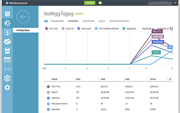 また、配置後の管理も簡単です。新しい管理ポータルで、CPU Time, Requests、Data Out, Data In(画面01:Webサイト・モニタリング)などを見ることができますので、サイトの状況を把握できますし、Webサイトのインスタンス数やサイズ(予約インスタンスのみ)、共有と予約インスタンスの変更もできます(画面02:Webサイト・スケール)。