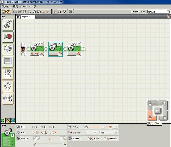 - こうして左のモーターを動かすブロックをつなぐっと。よし、ダウンロード、スイッチオン!