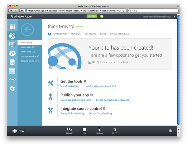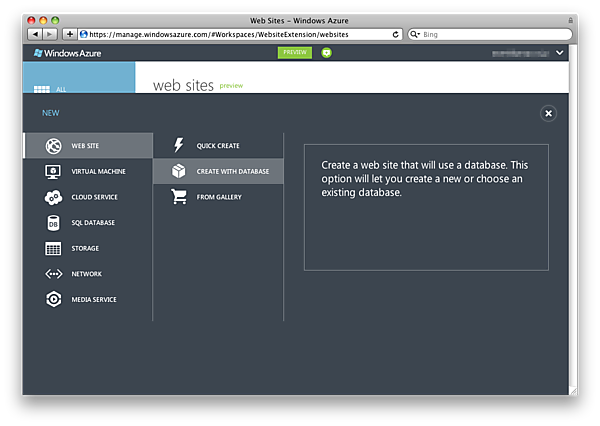 [QUICK CREATE]はWebサイトのみ、[CREATE WITH DATABASE]はWebサイトとデータベース、[FROM GALLERY]は前回の記事にも書かれていたようにWordPressなどのアプリケーションまでを構築するものになります。