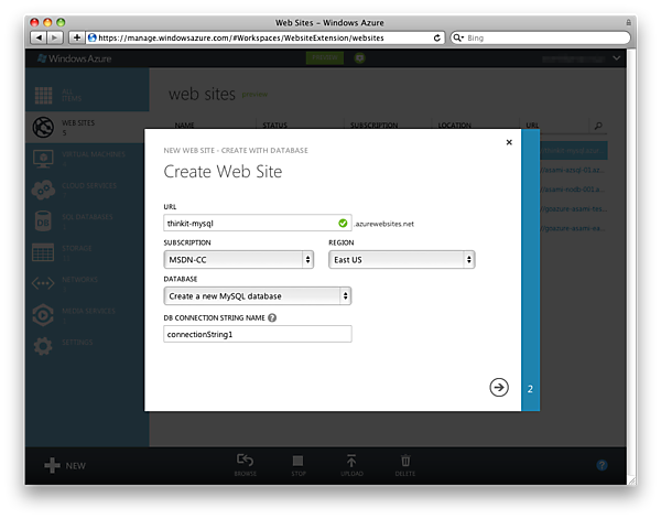 NEW WEB SITE - CREATE WITH DATABASEウィザードが表示されたら、Create web siteページで任意のURLを入力し、SUBSCRIPTION(複数ある場合のみ表示)、REGION(地域)を選択、DATABASEは[Create a new MySQL database]を選択し、DB CONNECTION STRING NAMEは接続文字列の識別名となる任意の文字列を入力します。