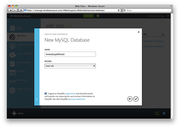 New MySQL DatabaseページでのNAMEはシステムが適当に付けたものが表示されていますが変更することも可能です。REGION(地域)は前のページで選択したのと同じ地域を選択するのがよいでしょう。ページ下のClearDBに関することにチェックします(画面03)。