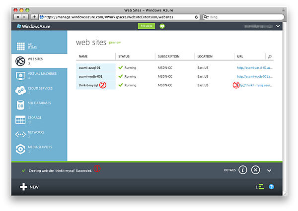 これだけでWebサイトの構築作業は完了です。Webサイトが開始されるとページ下に通知が表示されます (画面04の(1))。Webサイト名 (画面04の(2))をクリックすると、Webサイトの作成が成功したことを伝えるページ(画面05)が表示されます。URL(画面04の(3))をクリックすると作成直後のデフォルトドキュメント(画面06)が表示されます。