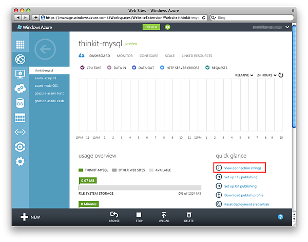 Webサイトの作成と同時に作成したデータベースの接続情報は、DASHBOARDの[View connection strings]をクリックすることで表示されます。