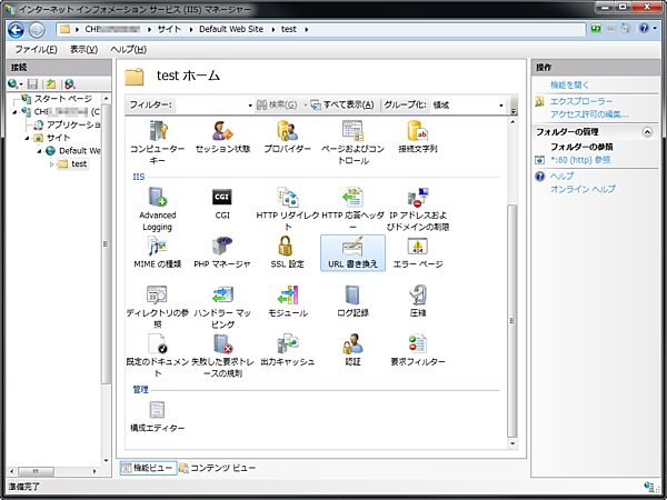 IISマネージャーで適当なフォルダを選択し、「URL書き換え」を開きます。なおこの際、このフォルダにweb.configファイルが存在しないことを確認してください。もし存在すると、他の設定が含まれていると困ります。その場合は新たなフォルダを作成してそちらで実施するのがよいでしょう。