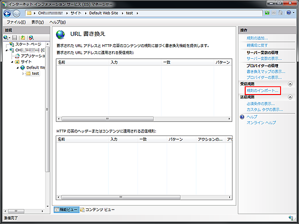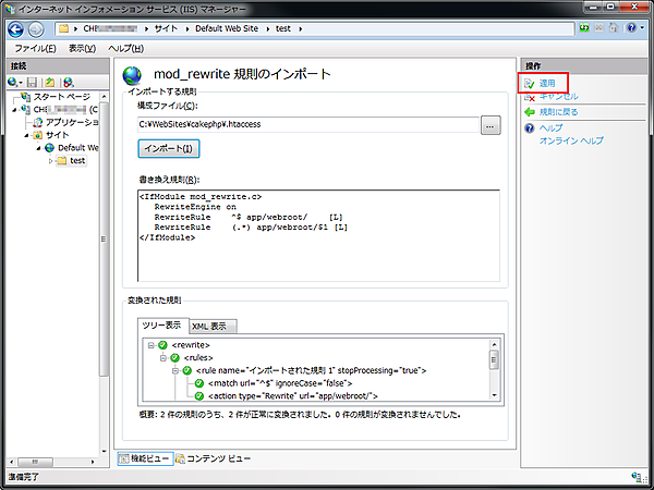 IISのURL Rewriteの設定は、インターネット インフォーメーション サービス (IIS) マネージャーでApache用のmod_rewriteの設定情報を読み込ませることが可能です。