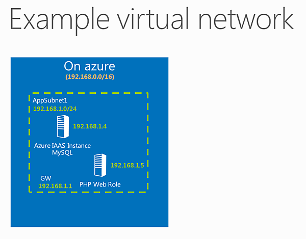 Windows Azureのみで一番シンプルな1つのサブネットを用意し、Windows Azure Cloud Services (PaaS)のPHPを実行可能なWeb RoleインスタンスとMySQLをインストールしたWindows Azure Virtual Machines(IaaS)インスタンスを起動し、同じサブネットに所属させます。