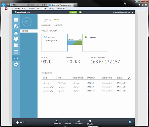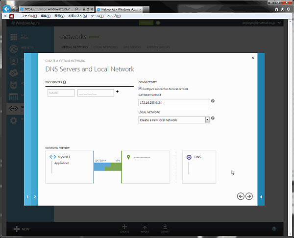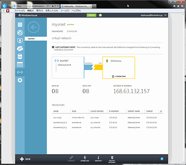 ここまでで、ローカルアドレスを含むVirtual Networkの定義が完了しています。Virtual Machineのインスタンスを構築する・Cloud Serviceのインスタンスを構築するに関してはケース1と同様ですが、現時点ではGatewaySubnetという名称が固定で振られます。今回はGatewaySubnetという名称のサブネットに所属しています。