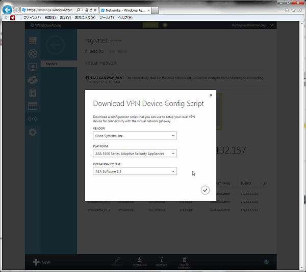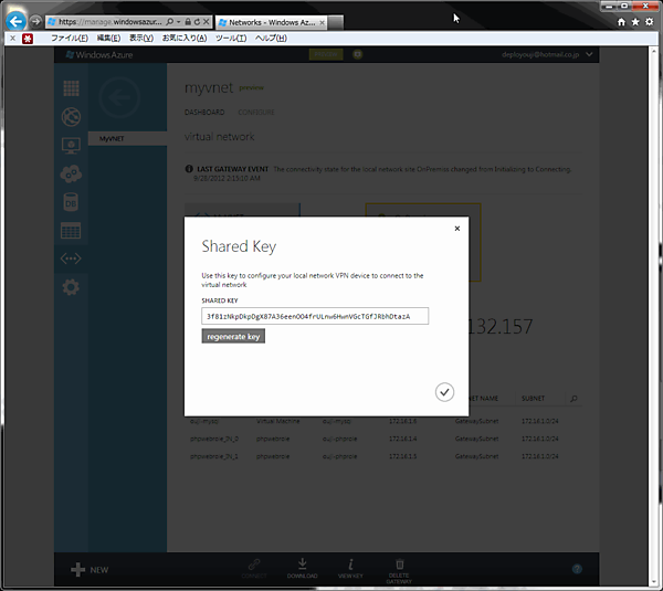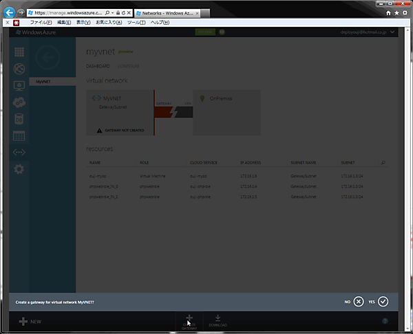 作成した時点では、まだIPsecのゲートウェイは稼働していません。作成したMyVNETのDASHBOARD画面下部のメニューバーに[CREATE GATEWAY]というアイコンが表示されています。クリックすると作成するか確認されますので、YESをクリックするとIPsec用のゲートウェイが準備されます。