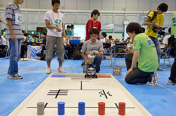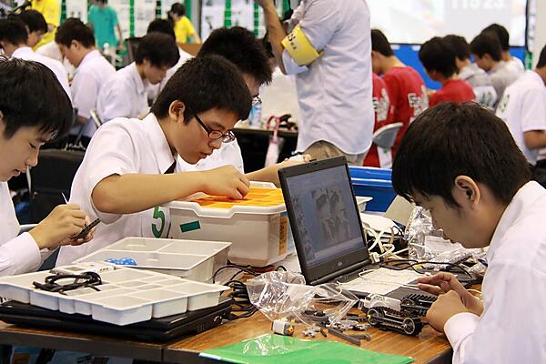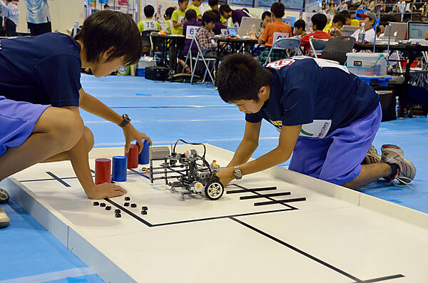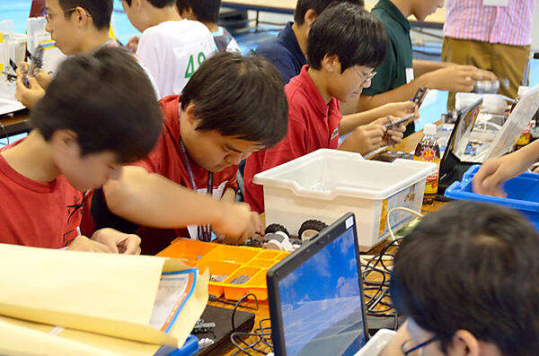 また、2〜3人のメンバーが作業分担するためにはチームワークが必須です。プログラム作成にパソコンへかじりつく人、ロボットを組み立てる人、競技コースを調べに行く人など、担当を分けて動いているチームも多い様です。作業時間が限られているため、つい焦ってしまう選手も多く、「落ち着いて~」とお互い声を掛け合っている様子も。思わずこちらもドキドキしながら見守りました。