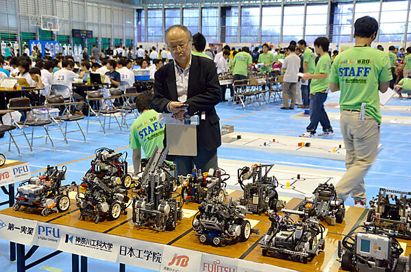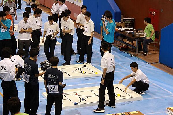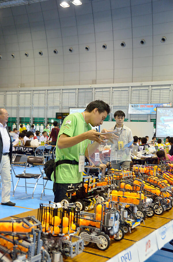 競技に向かう前に、ロボットが競技ルール規定に沿ったものか、車検で審査されます。全チームから出そろったロボットが車検コーナーに並ぶ様子は圧巻!同じ課題で挑んでも、まさに十人十色。チームの数だけ異なる形のロボットがズラリと勢ぞろいです。