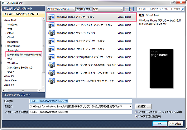 VS 2010のメニューから[ファイル(F)/新規作成(N)/プロジェクト(P)]と選択します。次に、「インストールされたテンプレート」から「Silverlight for Windows Phone」を選択し、右に表示される項目から「Windows Phone アプリケーション」を選択して、「名前(N)」に任意のプロジェクト名を指定します。ここでは「KINECT_WindowsPhone_Skeleton」という名前を付けています(図6)。Windows Phone OSのバージョンは7.1を選択します。