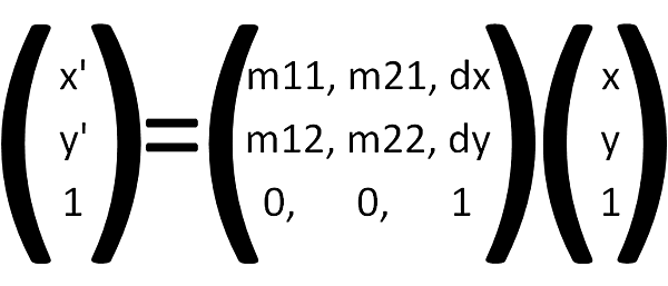 transformメソッドは、scale/rotate/translateメソッドをひとつにまとめたメソッドと言っても良いでしょう。以下のような変換マトリクスを使って、図形を変形させます。