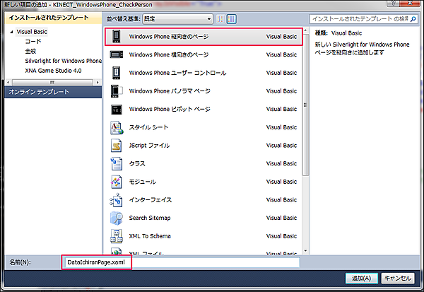 VS2010メニューの「プロジェクト(P)/新しい項目の追加(W)」と選択して、「Windows Phone 縦向きのページ」を選択します。「名前(N) 」にはDataIchiranPage.xamlと指定して[追加(A)]ボタンをクリックします(図7)。