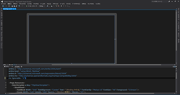 図5:上にデザイン画面、下にXAMLコードの記述された画面が表示される(クリックで拡大)