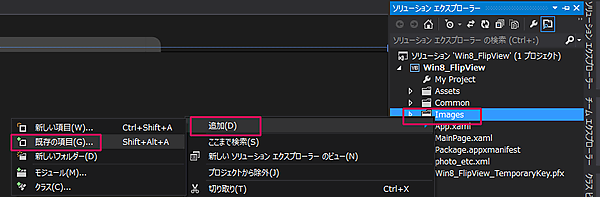 次に、ソリューションエクスプローラー内のWin8_FlipViewプロジェクトを選択した状態で、マウスの右クリックをし、表示されるメニューから「追加(D) /新しいフォルダ(D)」と選択して、名前がImagesというフォルダを作成します(図8)。作成したImagesフォルダを選択し、マウスの右クリックで表示されるメニューから「追加(D)/既存の項目(G)」と選択して(図9)画像ファイルを追加しておきます(図10)。また、Win8_FlipViewプロジェクトと同じ階層に、リスト1のXMLファイルを追加しておきます。