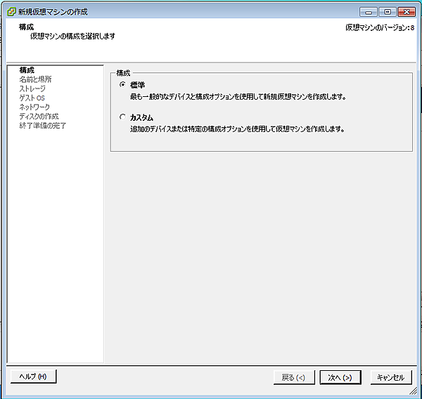 「構成」の項目では一般的な構成設定を利用する「標準」と、CPUやメモリなど詳細に設定できる「カスタム」の2つから選ぶことができます。特にカスタマイズする必要なければ「標準」を選びます。