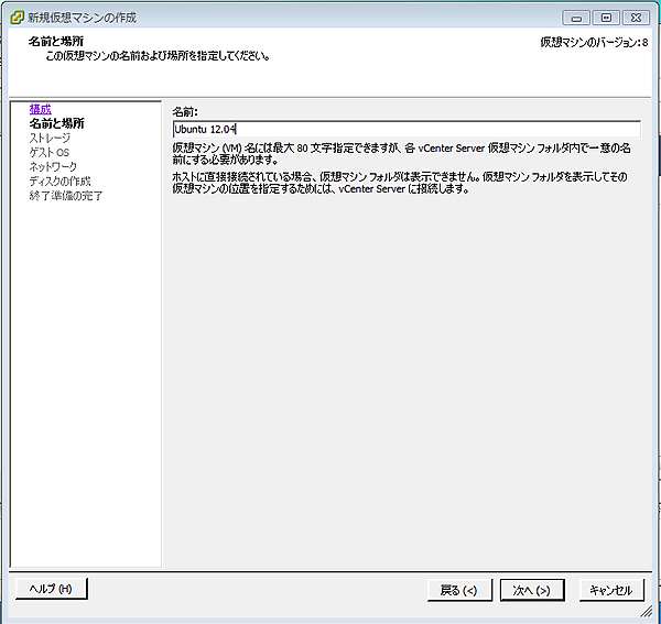インベントリ画面の左ペインのサーバーアイコンを右クリックし「新規仮想マシン」を選び、ウィザードを開きます。