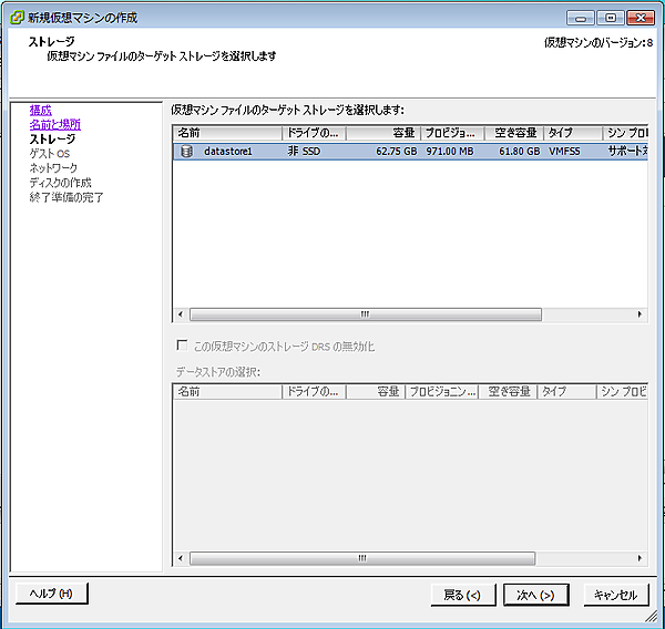 「ストレージ」では「仮想マシンの作成先」を指定します。