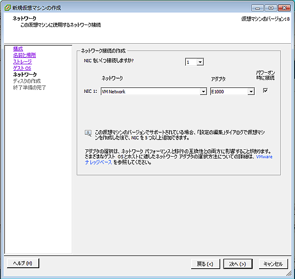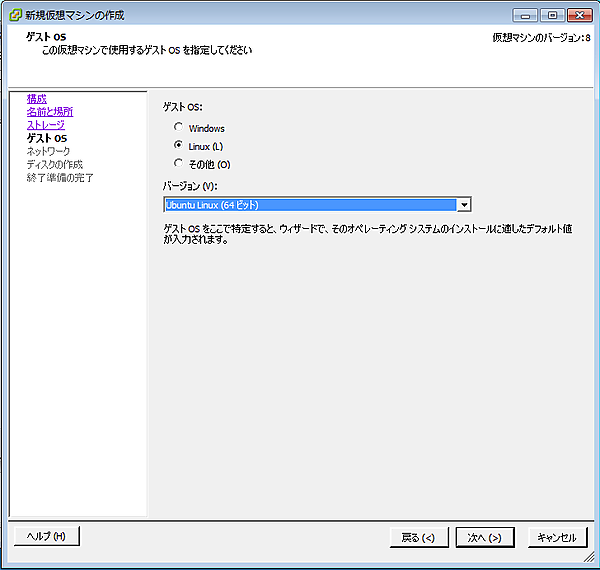 「ゲストOS」ではインストールしようとしているOSの種別やバージョンを指定します。ここで的確な設定をするとゲストOSに最適化されたパラメータが設定されます。