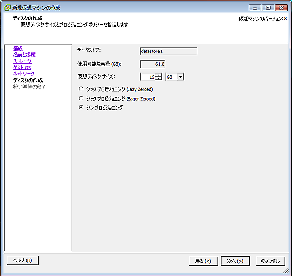 「ディスクの作成」では仮想ディスクに割り当てるサイズとフォーマット形式を指定します(フォーマット形式の違いについては前回の記事をご参照ください)。