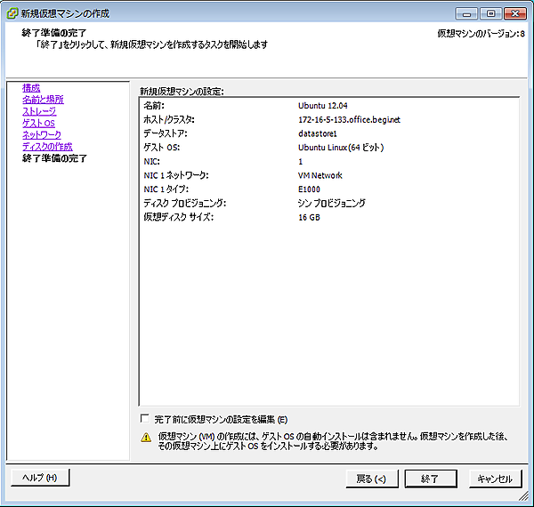 最後に設定のサマリーがでてきますので、問題がなければ「終了」ボタンをクリックします。