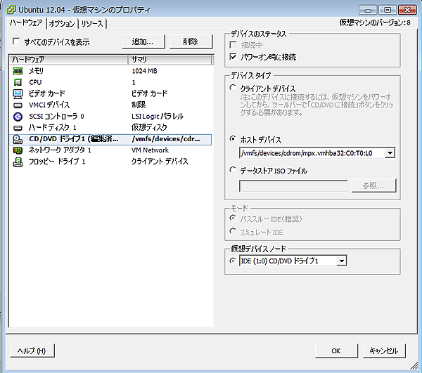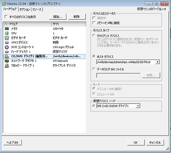 - ESXiをインストールしたマシン(ホスト)のCD/DVDドライブを指定