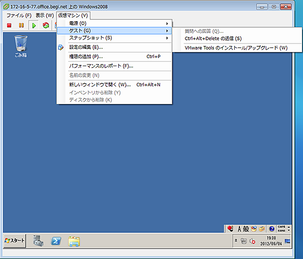 - ゲストOSが起動されたらコンソール画面のツールバーより[仮想マシン]-[ゲスト]-[VMware Toolsのインストール/アップグレード]を選びます。