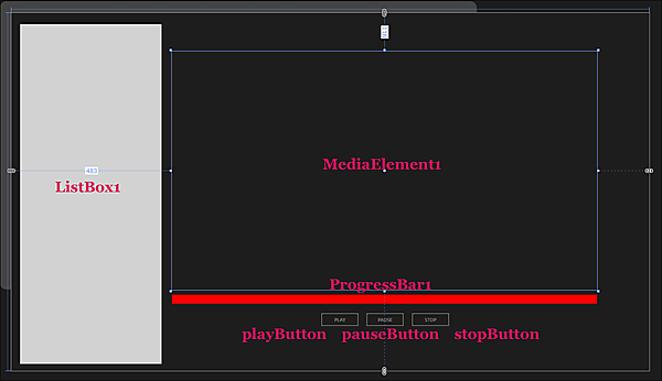 次に、ツールボックスからデザイン画面上にMediaElementコントロールを1個、ListBoxコントロールを1個、Buttonコントロールを3個、ProgressBarコントロールを1個配置します。MediaElementのプロパティの[メディア]パネル内にある、AutoPlayプロパティのチェックを外して、自動的に再生されるのを禁じておきます。ButtonのContentプロパティには左から[PLAY][PAUSE][STOP]と指定しておきます。最初の状態では、これら3つのボタンのプロパティの[共通]パネル内にある、IsEnabledプロパティのチェックを外して使用不可としておきます。ProgressBarのBackgroundプロパティにRedを指定しておきます。各コントロールを配置すると図6のようになります。