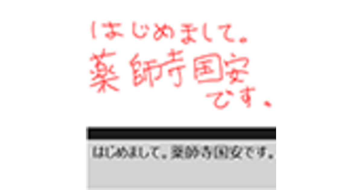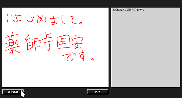 今回はタッチスクリーンを使って、フリーハンドで入力した文字を認識するサンプルです。フリーハンドで文字を書いたのち、〔文字認識〕ボタンをタップすると、右のボックスに認識された文字が表示されます。一文字ずつ丁寧に書いてください。うまく認識できない場合もありますので、ご了承ください(図1)。タッチスクリーンだけでなく、マウスで書いた文字も認識できます。